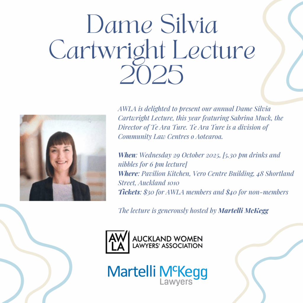 AWLA is delighted to present our annual Dame Silvia Cartwright Lecture, this year featuring Sabrina Muck, the Director of Te Ara Ture. Te Ara Ture is a division of Community Law Centres o Aotearoa Incorporated that connects legal need to volunteer lawyers, and coordinates the Framework for Collaborative Pro Bono, which is a profession-led initiative dedicated to supporting and promoting pro bono within law firms in Aotearoa.